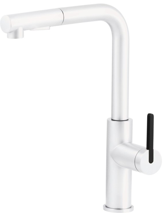 Bateria Momi, stworzona z najwyższej jakości stali nierdzewnej, zachwyca swoim nowoczesnym, prostokątnym kształtem wylewki, która nadaje jej wyjątkowego charakteru. Wbudowany aerator napowietrza strumień wody, co pozwala efektywnie ograniczyć jej zużycie, nie tracąc przy tym na intensywności przepływu. Wyciągana wylewka zapewnia pełną swobodę ruchu, ułatwiając codzienne prace w kuchni, także te wymagające sięgnięcia w trudno dostępne miejsca. Do dyspozycji są dwa rodzaje strumienia - delikatny, napowietrzony idealny do mycia oraz miękki, deszczowy, perfekcyjny do płukania warzyw i owoców. Całość dopełnia eleganckie, matowe białe wykończenie, które wprowadza do kuchni subtelną elegancję i nowoczesną lekkość.